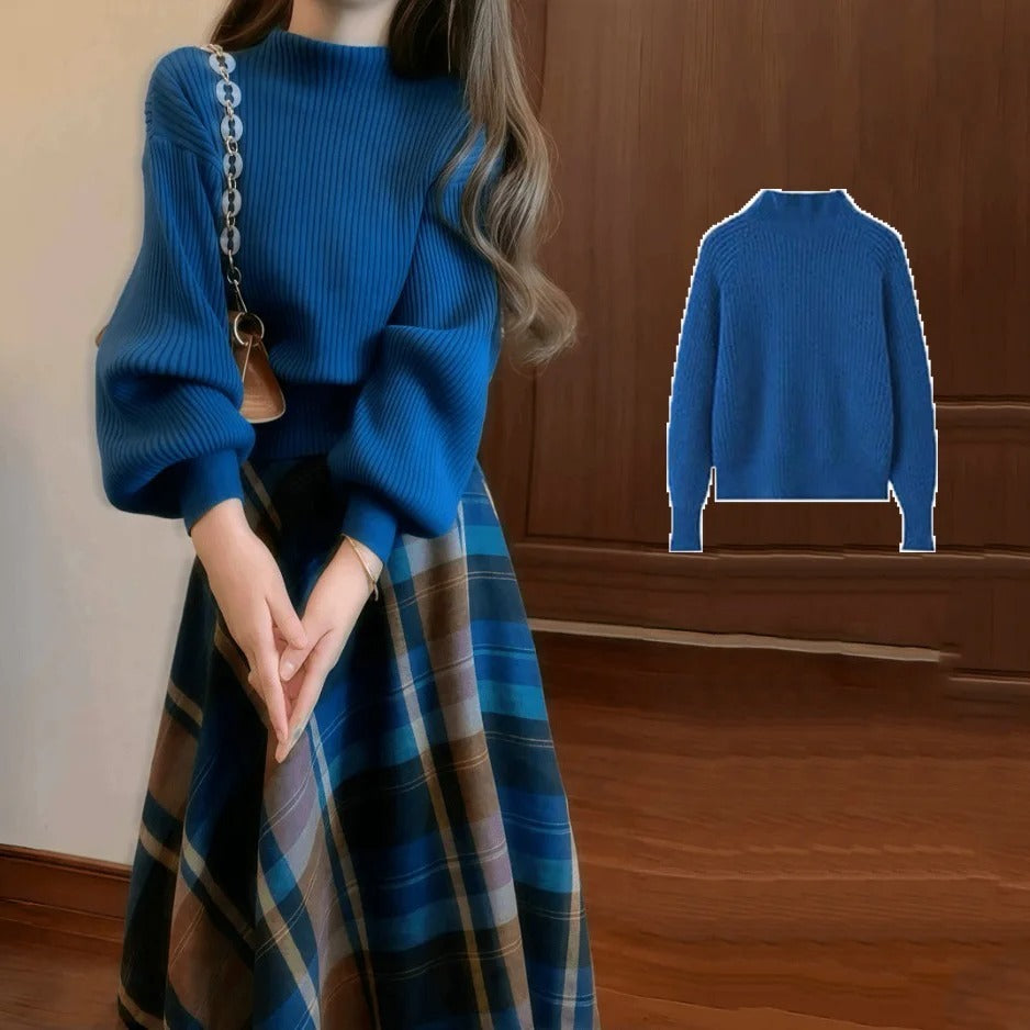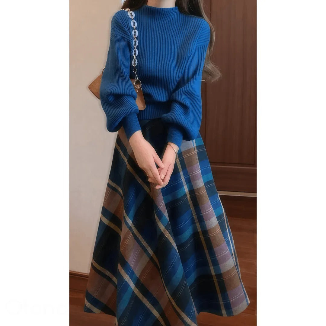 【単品販売】カジュアル 無地 ハーフネック ニット+チェック柄 スカート 二点セット