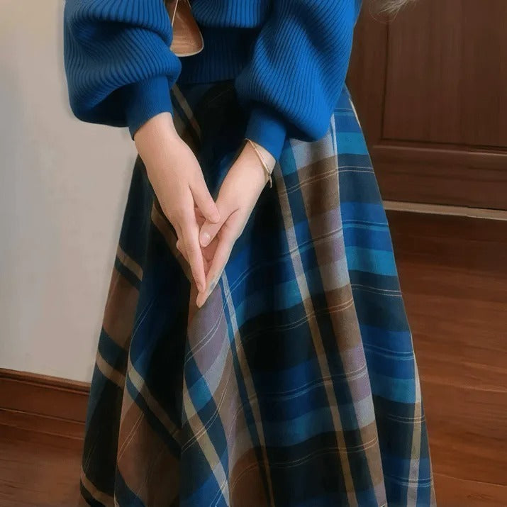 【単品販売】カジュアル 無地 ハーフネック ニット+チェック柄 スカート 二点セット