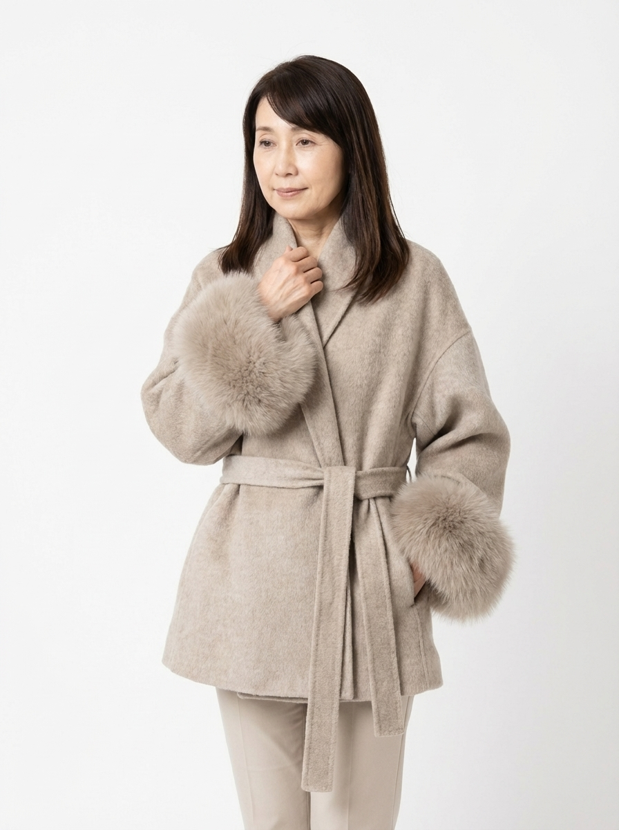 Keiは、ウール調素材の落ち着いた質感と、さりげないファー切り替えが印象的なエレガントコートです。