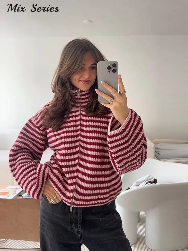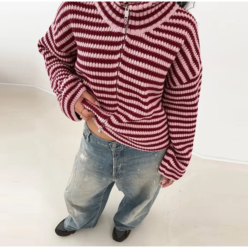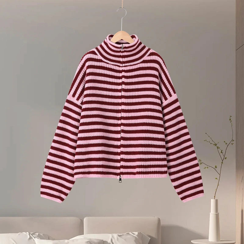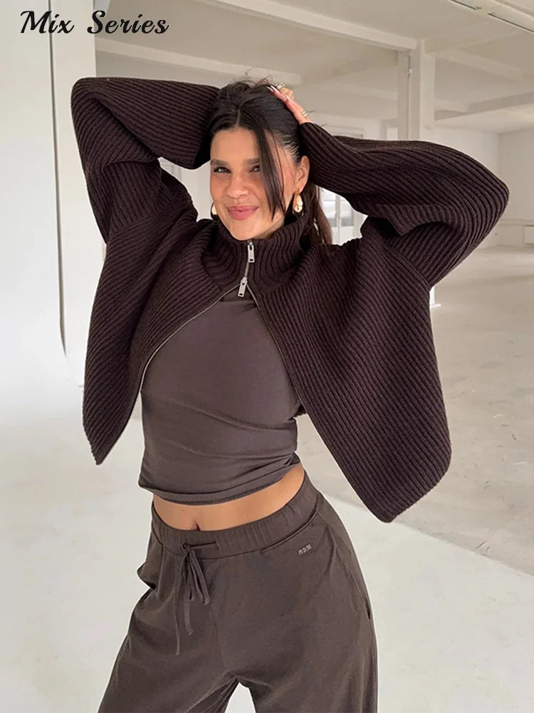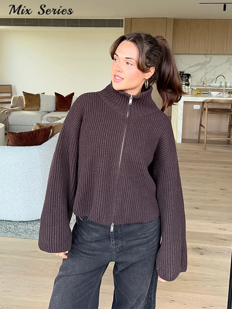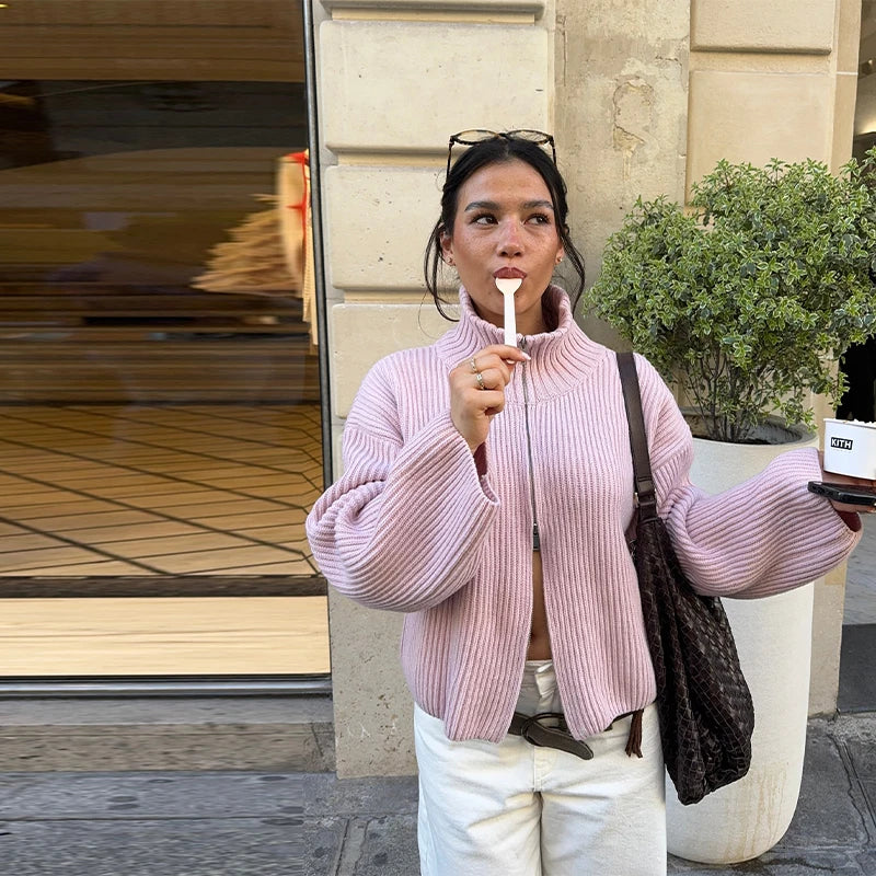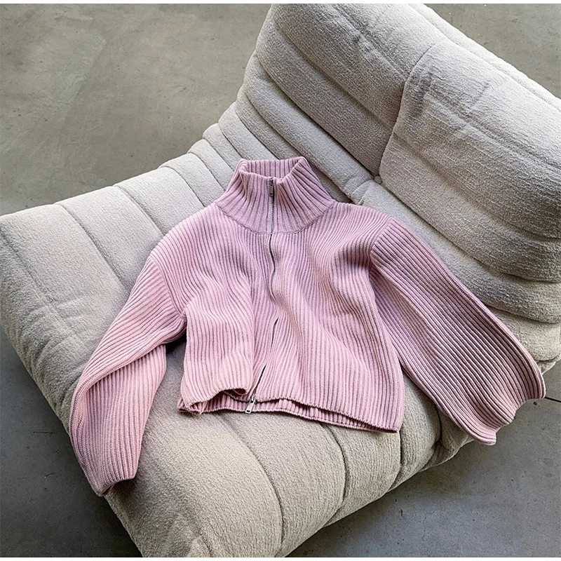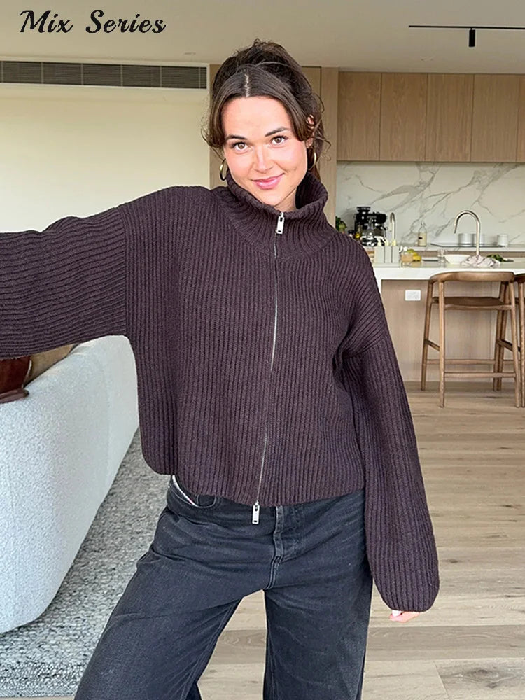 Tomokoは、リブ編みの表情とタートルネックが印象的な、ミニマルデザインのニットカーディガンです。