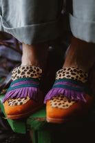 このローファーは真のスタイルステートメントです:鮮やかなフリンジ、対照的なディテール、そして目を引くアニマルプリントの驚くべき組み合わせ。