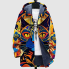 デザイン:鮮やかな色彩と幾何学的パターンで描かれた抽象的な猫モチーフ