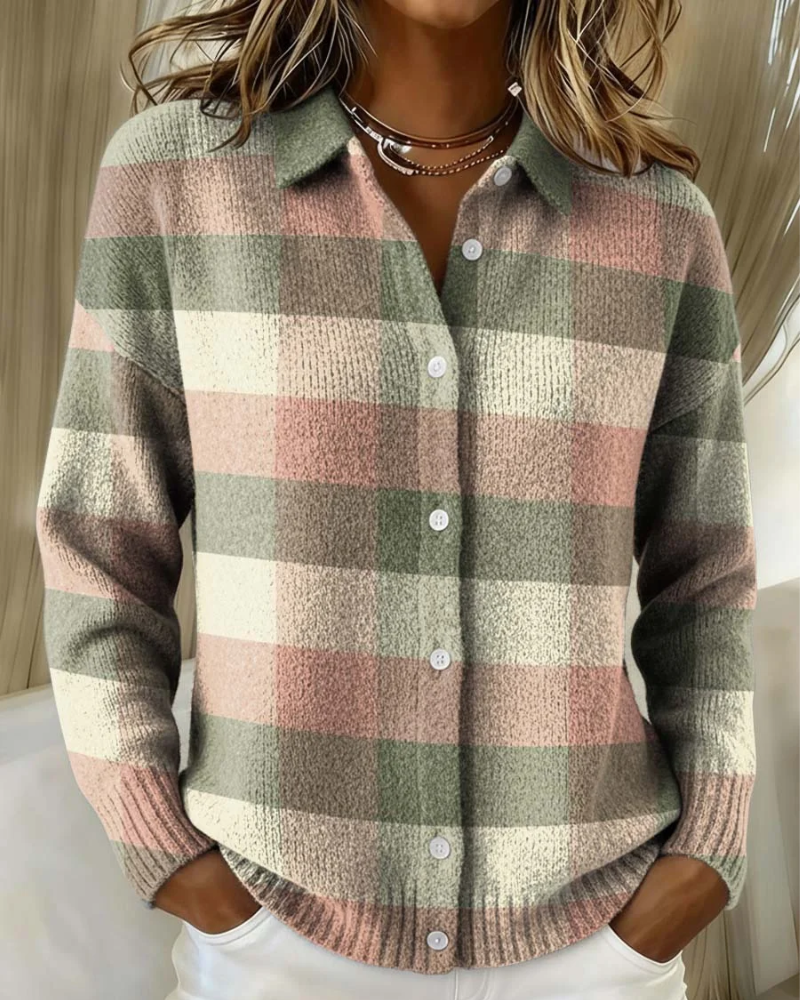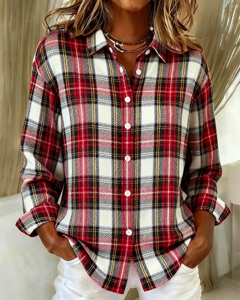 このブラウスは、深みのあるカラーを組み合わせたチェック柄が特徴で、クラシックさとモダンな印象を両立しています。ボタン付きの前立てと端正な襟元が、どんなスタイルにも合わせやすい多用途なデザインを引き立てます。