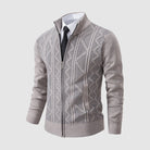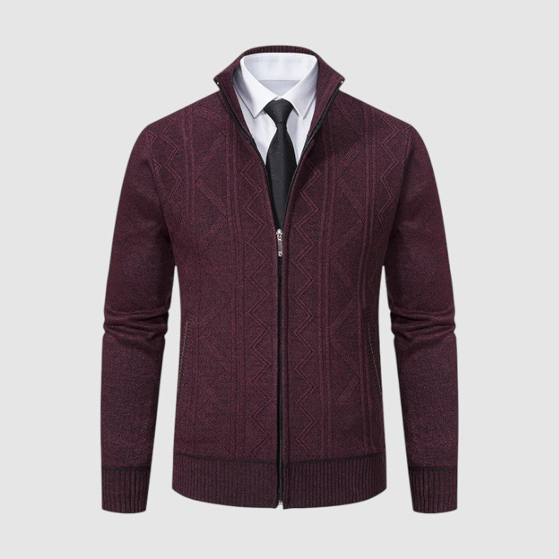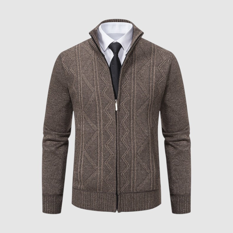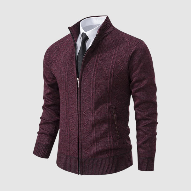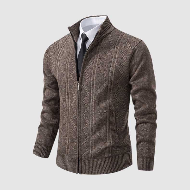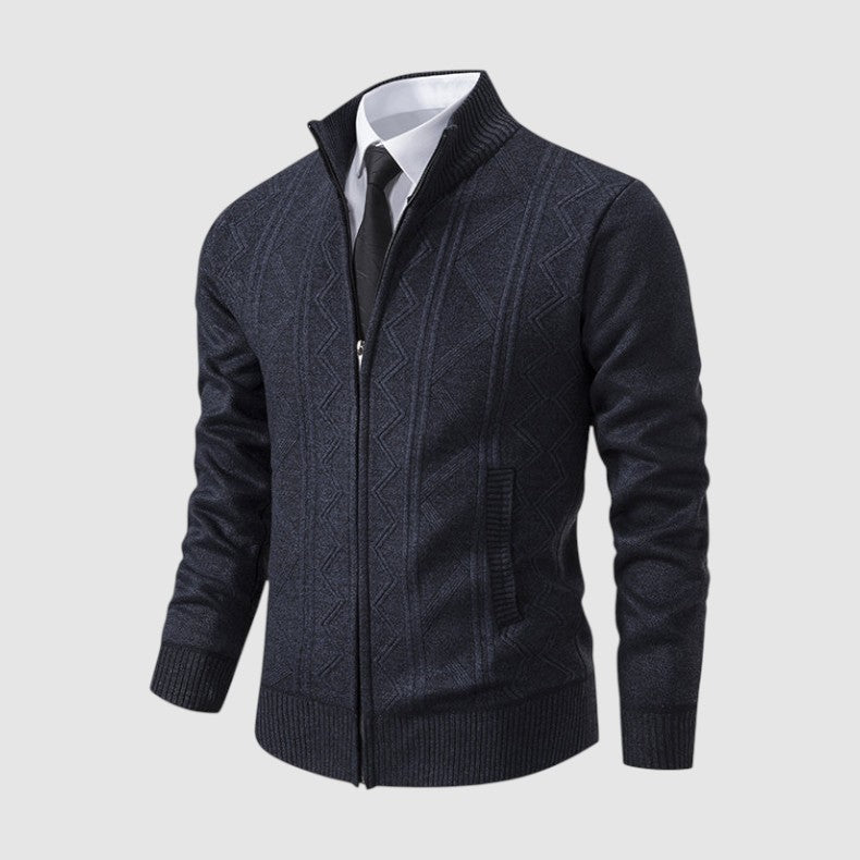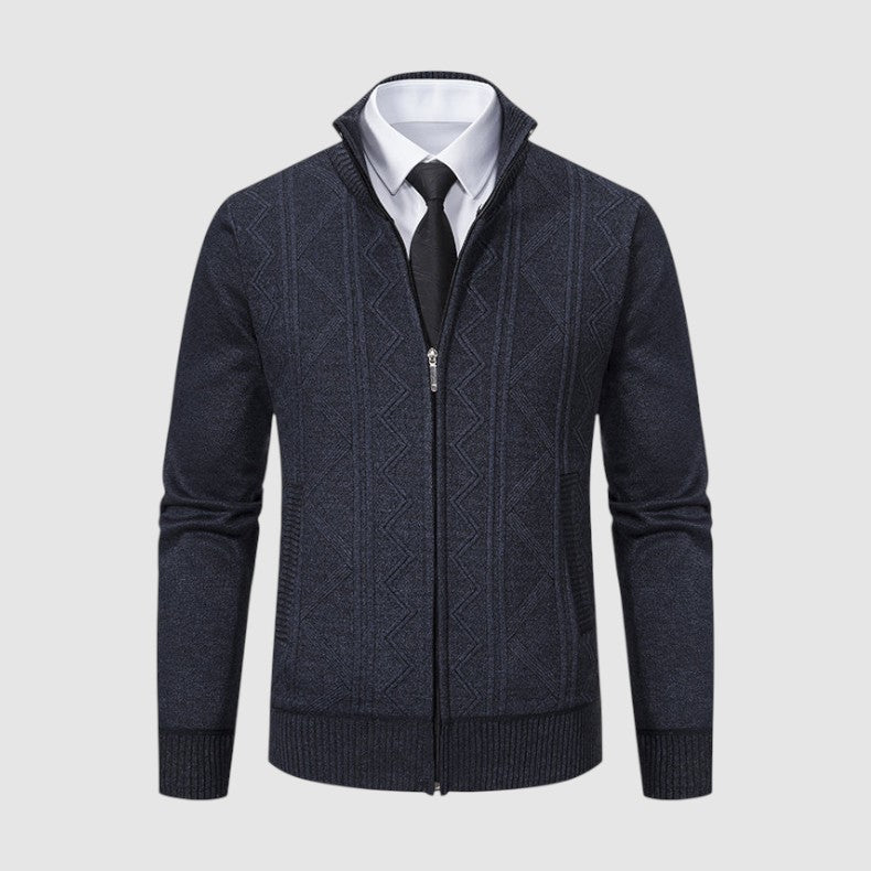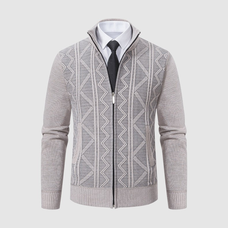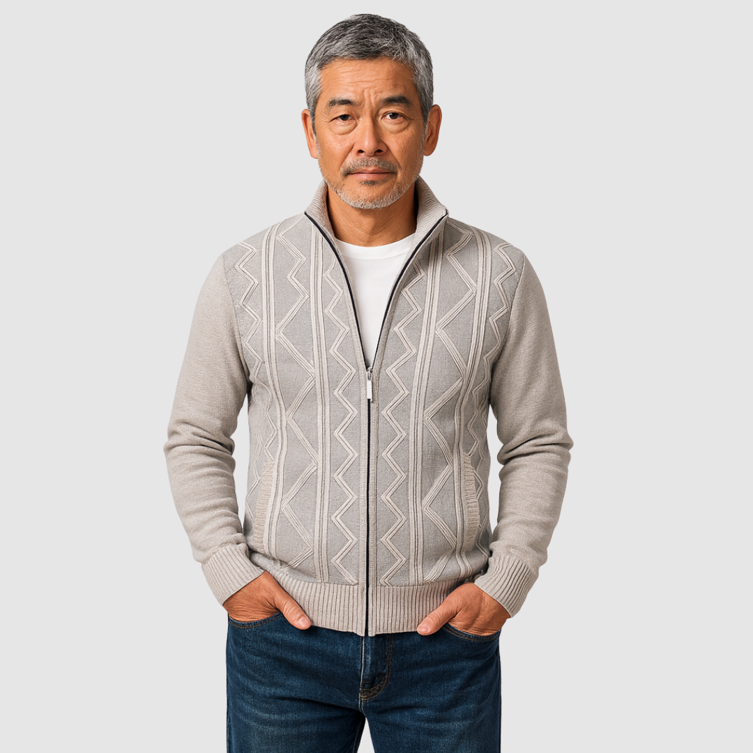 スタイルと快適さが見事に調和した一枚。優雅な幾何学模様のニットとシックなジップアップデザインが、ビジネスからレジャーまであらゆるシーンで活躍します。