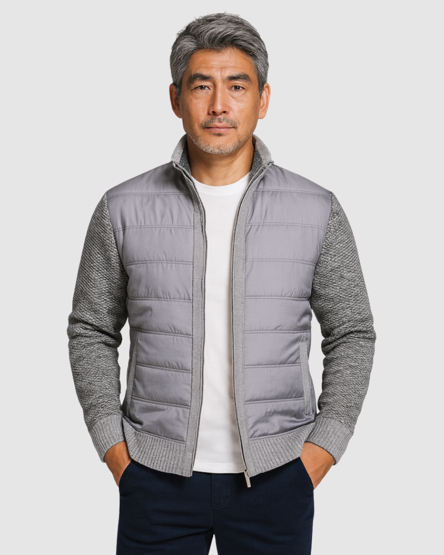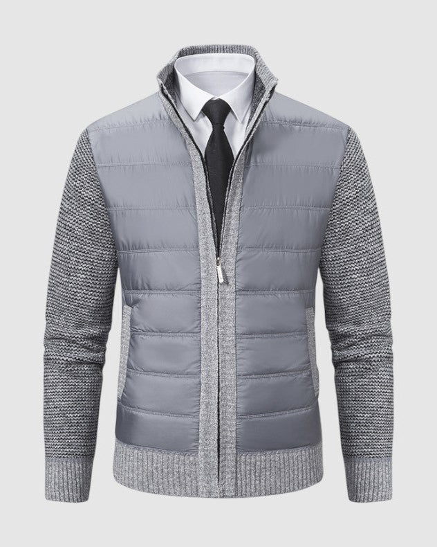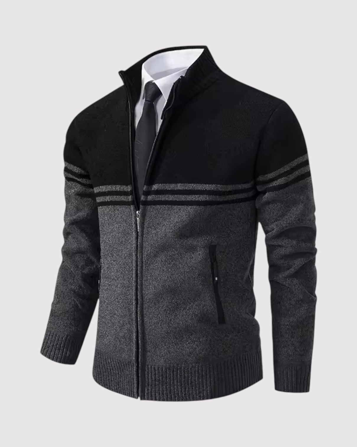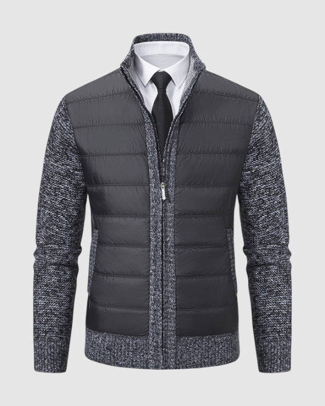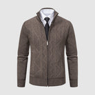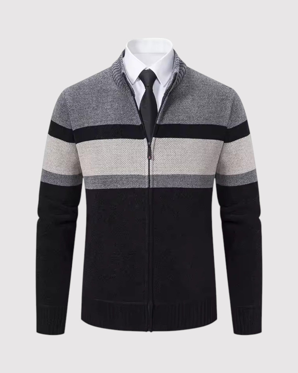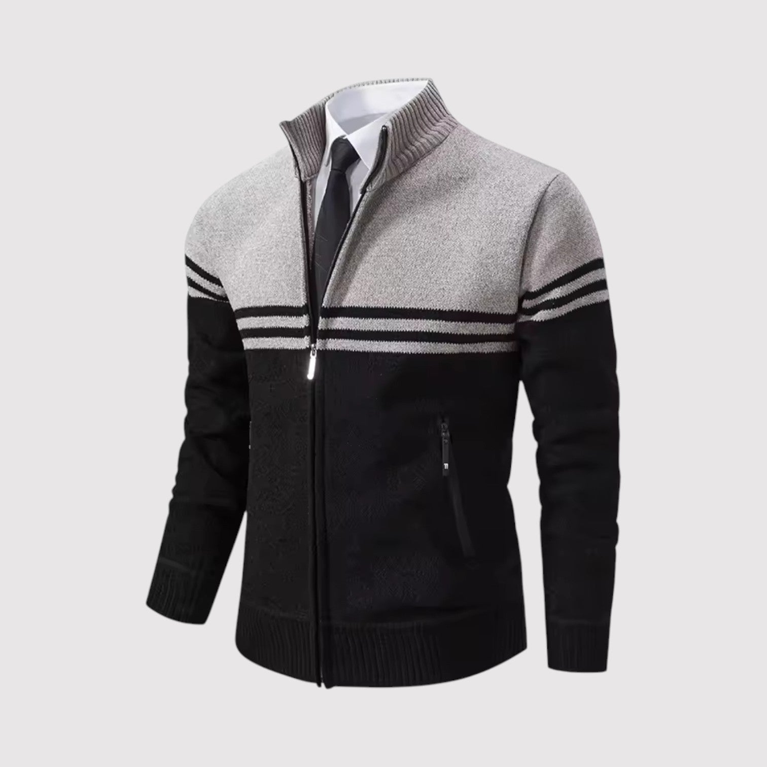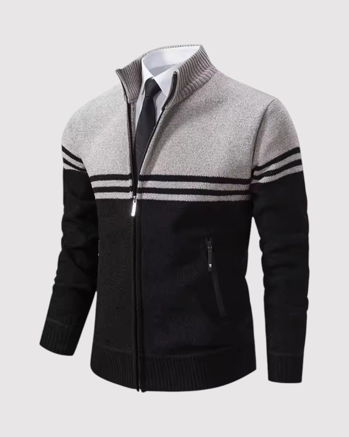 スタイルと快適さが見事に調和した一枚。優雅な幾何学模様のニットとシックなジップアップデザインが、ビジネスからレジャーまであらゆるシーンで活躍します。