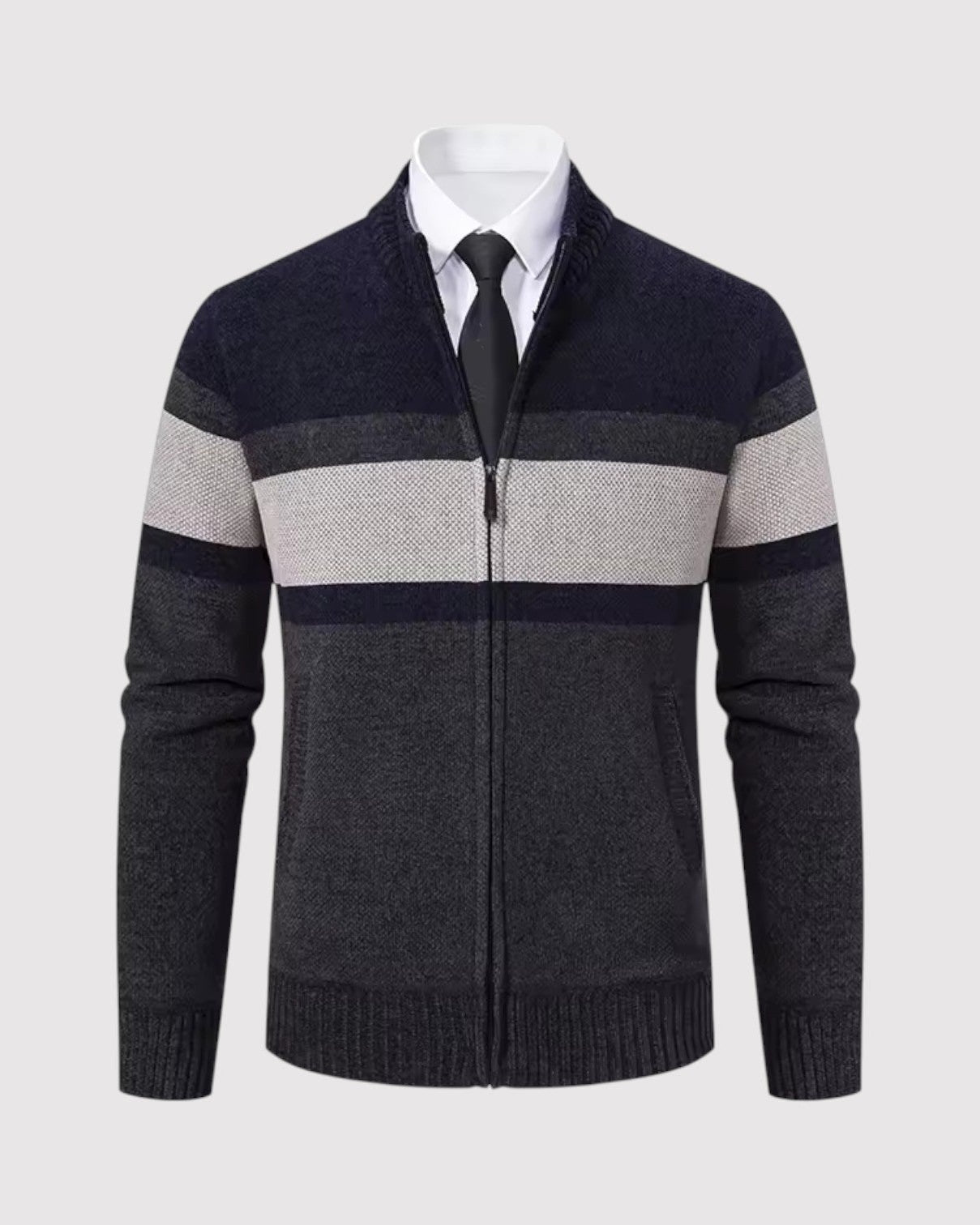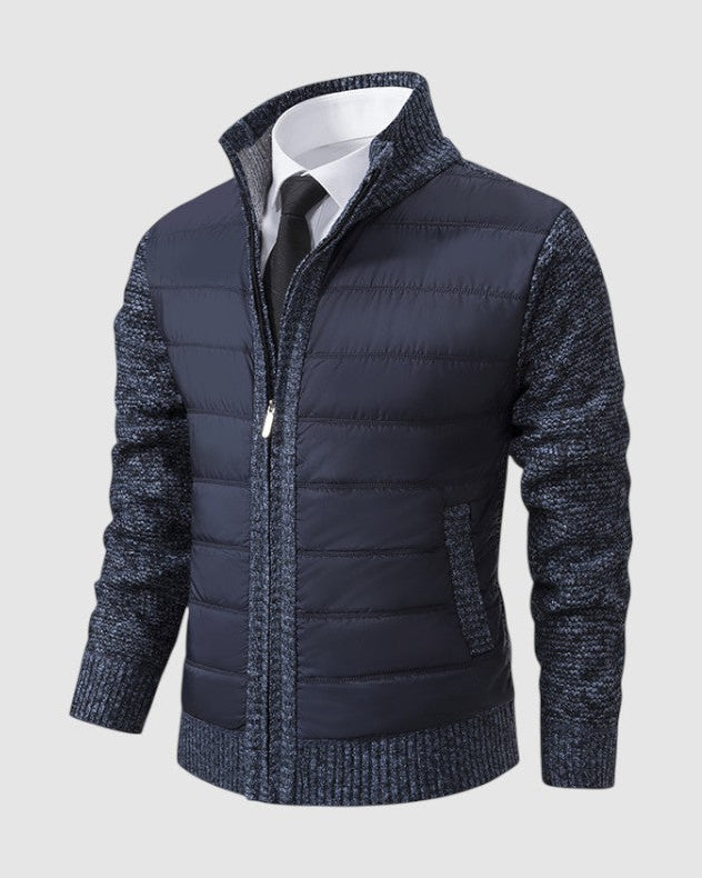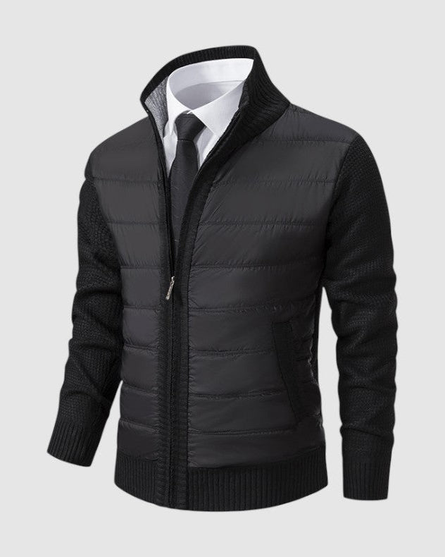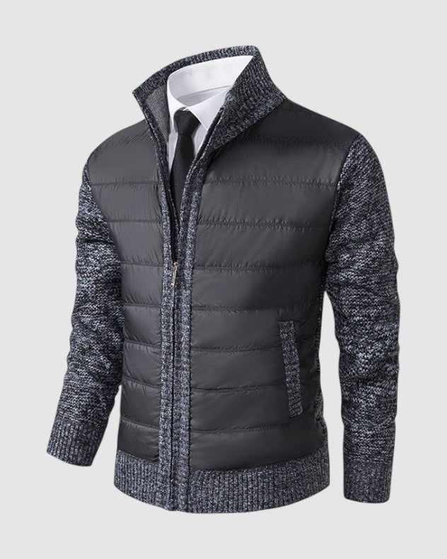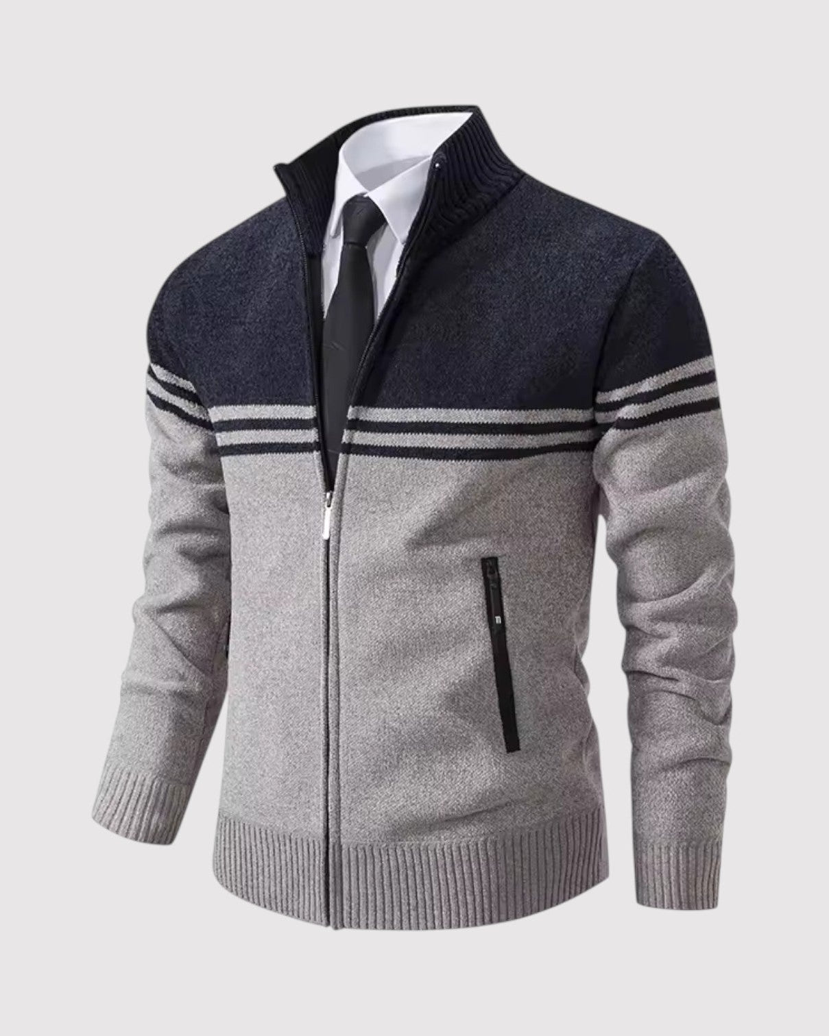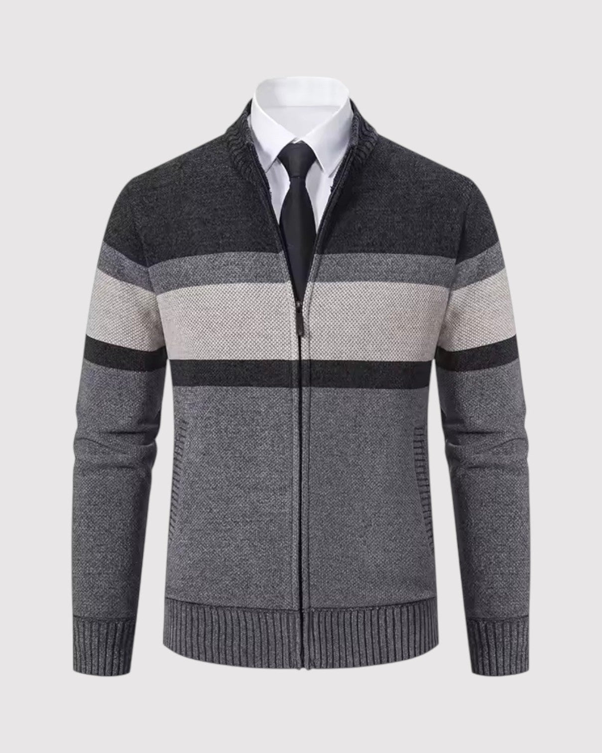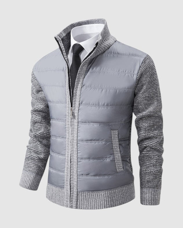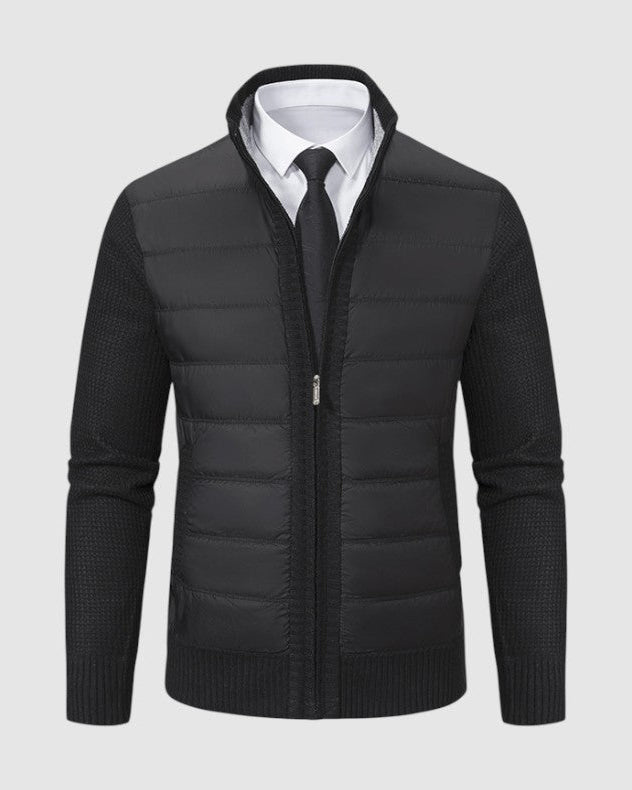 スタイルと快適さが見事に調和した一枚。優雅な幾何学模様のニットとシックなジップアップデザインが、ビジネスからレジャーまであらゆるシーンで活躍します。