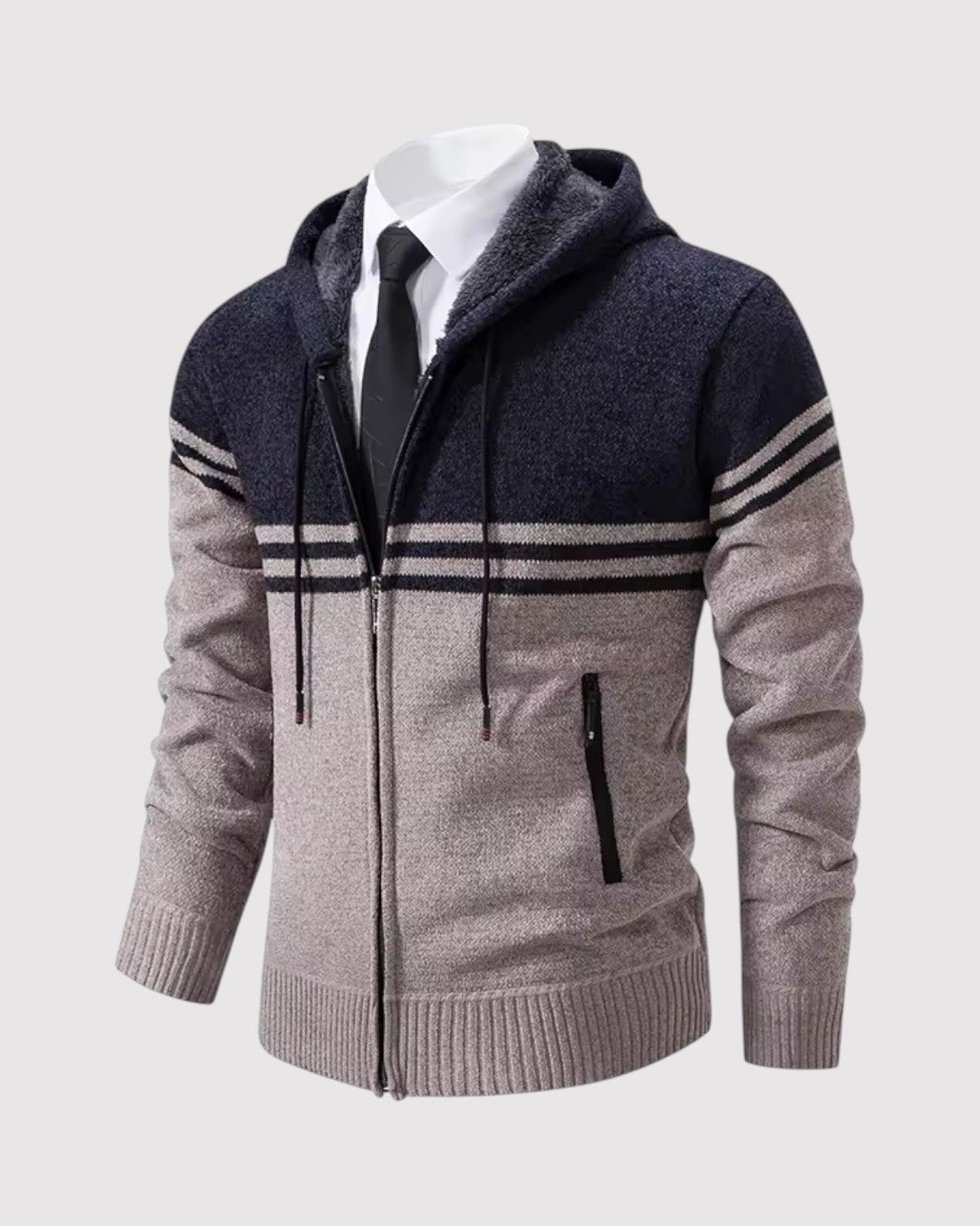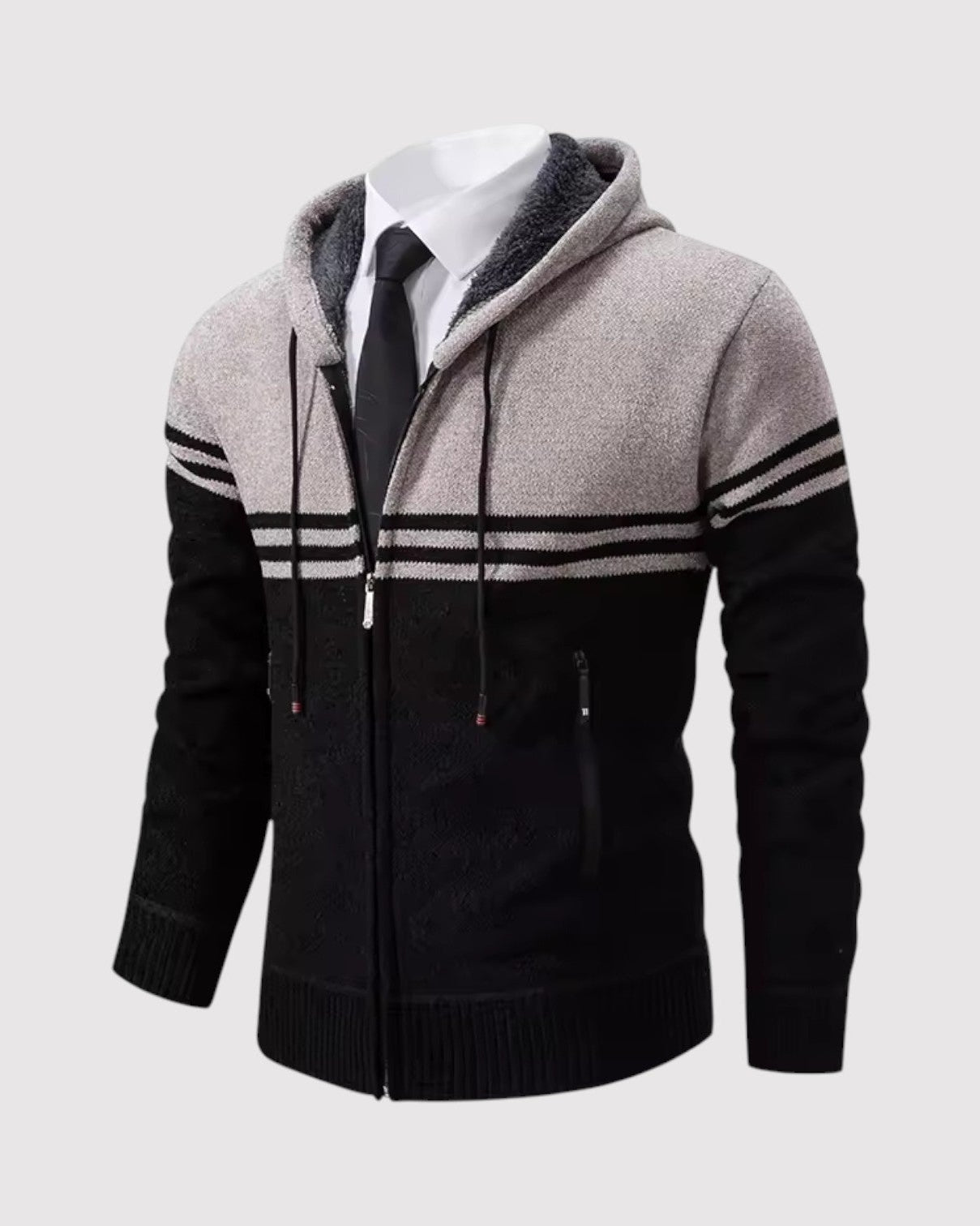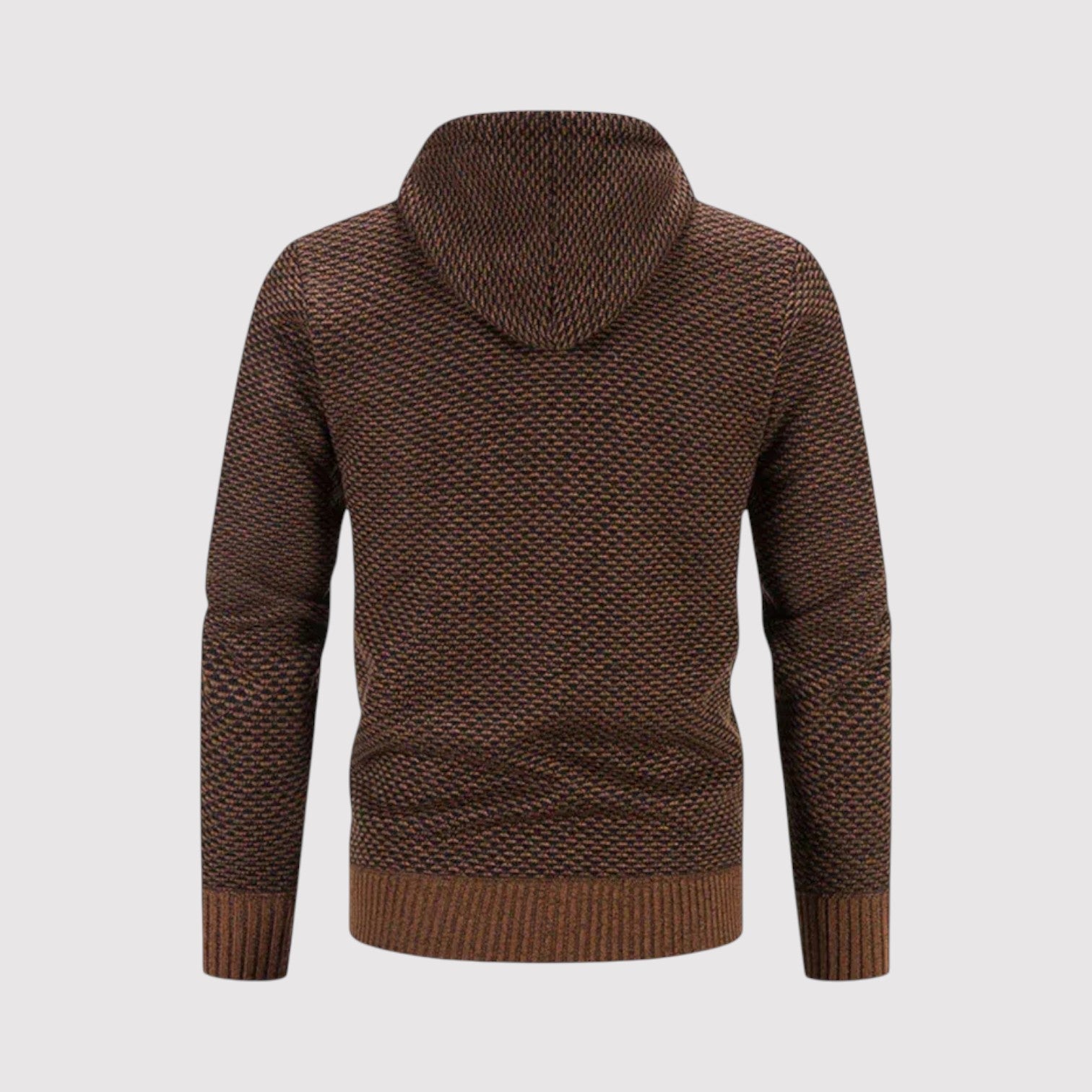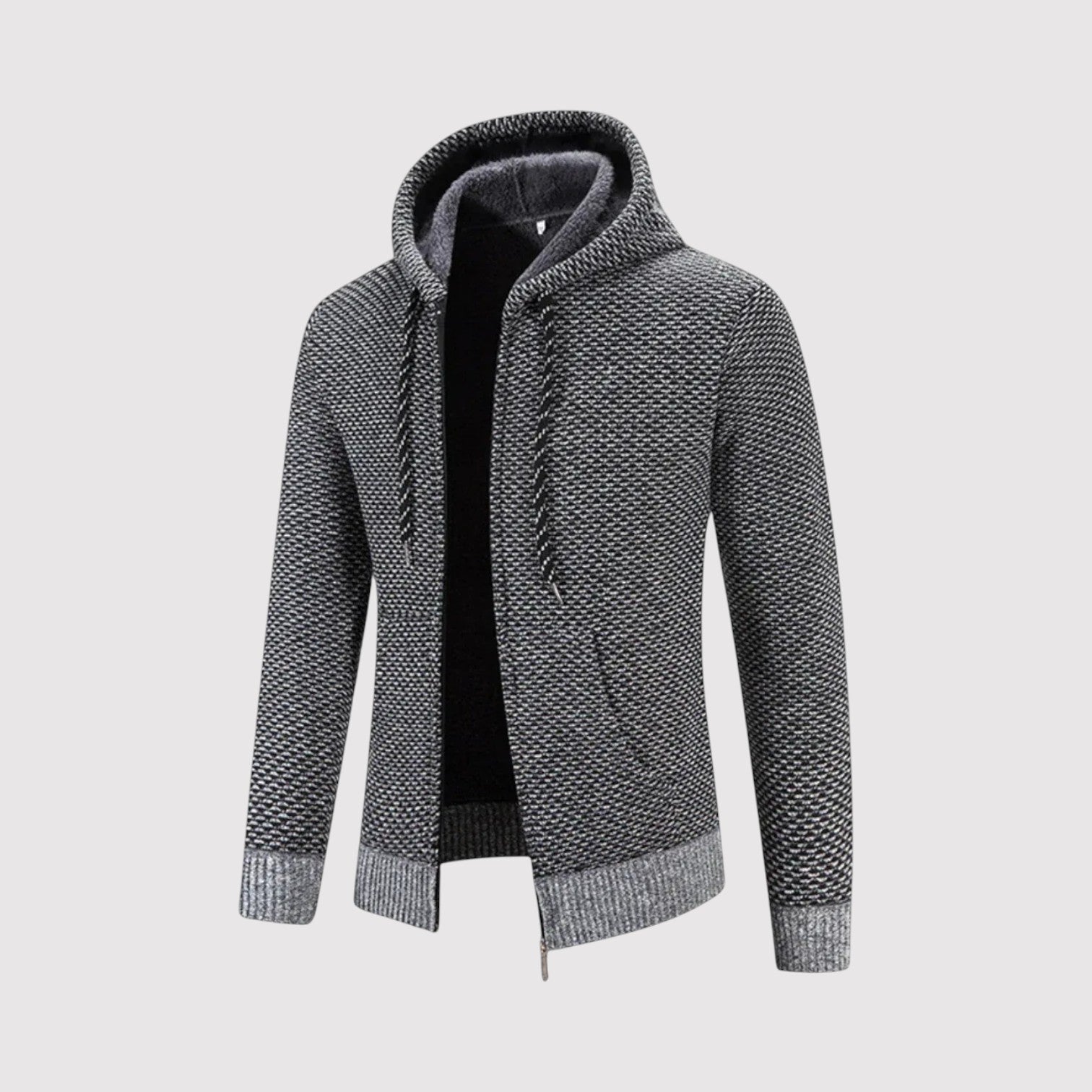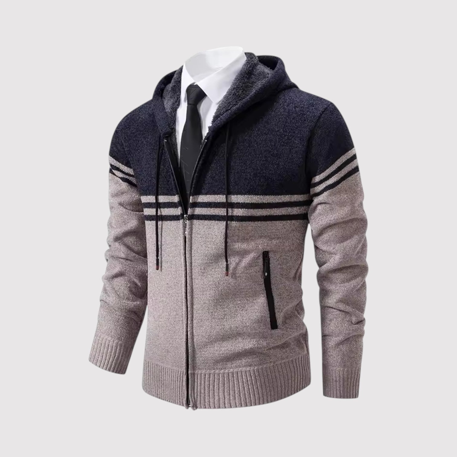 スタイルと快適さが見事に調和した一枚。優雅な幾何学模様のニットとシックなジップアップデザインが、ビジネスからレジャーまであらゆるシーンで活躍します。
