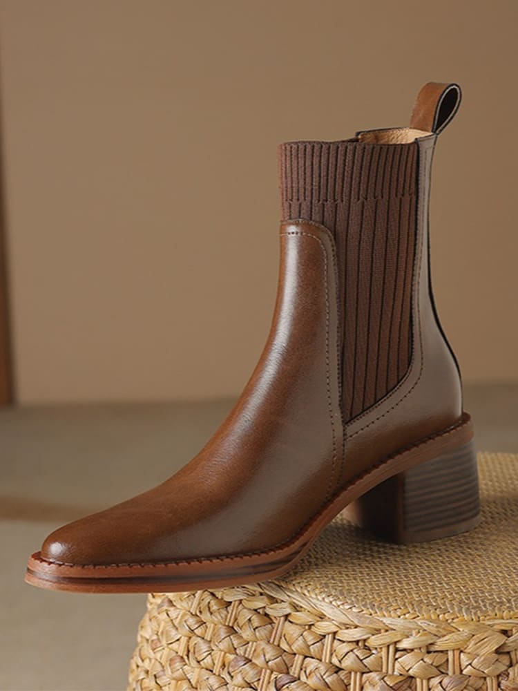 足首のニット素材がフィットして細見え効果のある、履き心地の良いブラウンブーツ