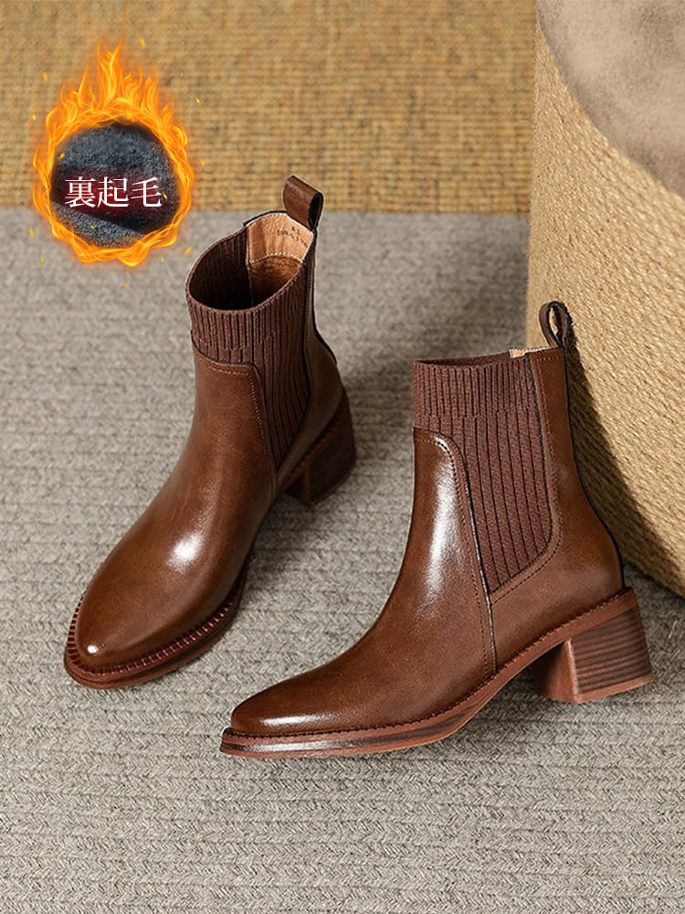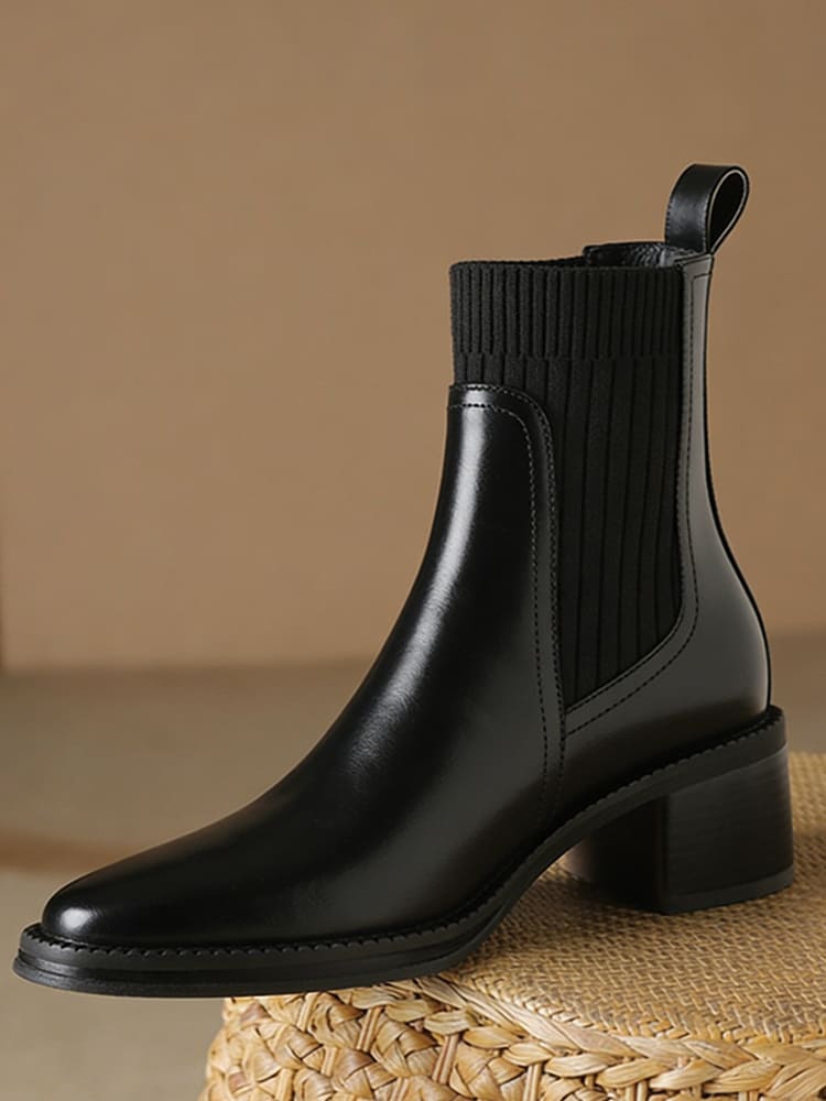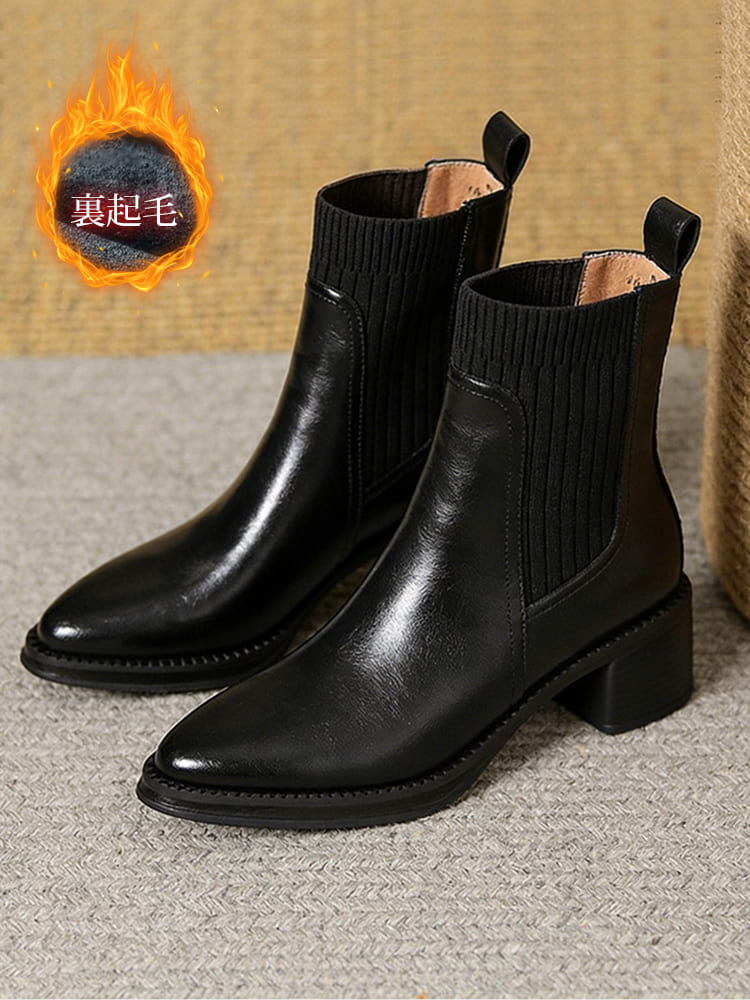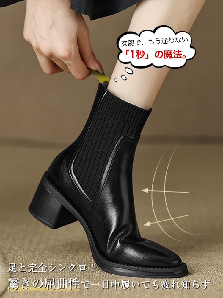 Misaki |【痛くない 本革×ニット】脱ぎ履き楽々 ショートブーツ 5.5cmヒール 外反母趾 幅広 疲れにくい レディース 裏起毛 防寒 通勤