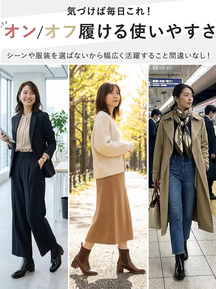 痛くなりにくいクッション、美脚見えヒール、定番カラーが人気のロングセラーブーツ。